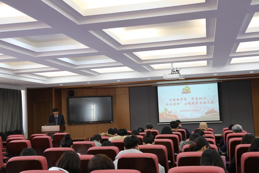 于12月19日下午在外语楼500报告厅召开了“不忘初心、牢记使命”主题教育总结大会。学校主题教育第十一指导组组长、党委统战部部长丁世海到会指导。学院领导班子成员、两委委员、系室主任、党支部书记以及部分教师和学生代表参加了本次会议。会议由学院院长周异夫主持。
