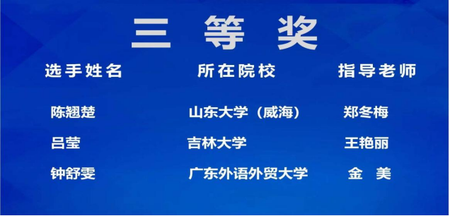 翻译硕士朝鲜语口译专业吕莹同学荣获三等奖。吕莹同学本次大赛指导教师为朝鲜语系王艳丽老师