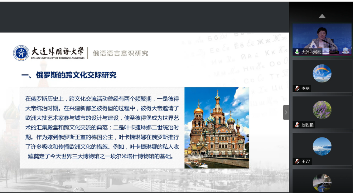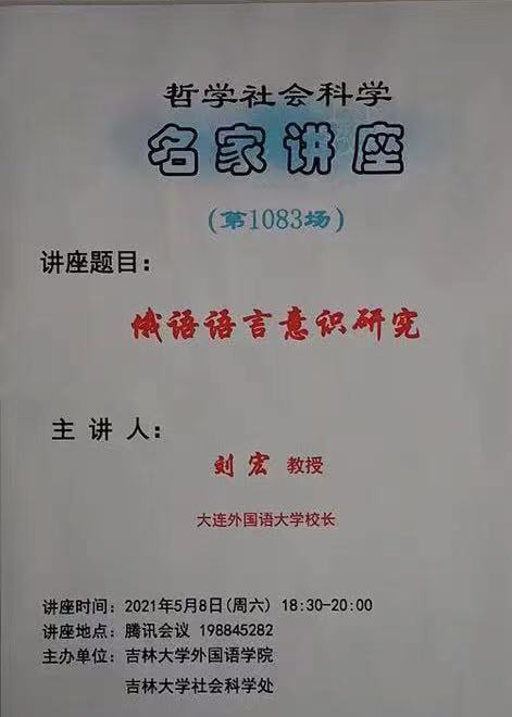 邀请,大连外国语大学校长刘宏教授于2021年5月8日18:30在腾讯会议平台为我院俄文系师生做了一场题为“俄语语言意识研究”的哲学社会科学名家学术讲座,讲座由俄文系刘佐艳教授主持。-