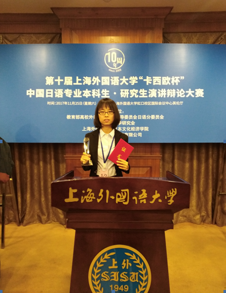 本次比赛分为即席演讲和辩论两个环节。即席演讲环节,参赛选手需抽签决定演讲题目。之后,还要回答评委随机提出的两个问题。此环节主要考察选手的语言组织能力、表达能力、临场发挥能力等;辩论环节正反方各四人,辩论题目和所在团队同样由抽签决定,此环节主要考察学生的思辨能力、语言组织能力、团队协作能力等。本次比赛共有来自上海交通大学、复旦大学、南开大学、南京大学、上海外国语大学等23所国内著名高校的24名本科生和研究生同台竞技。在各校高手云集、竞争激烈的比赛过程中,孙听雨同学展示了扎实的语言学习功底、缜密的思辨能力以及良好的心理素质,为学校和学院争得了荣誉。