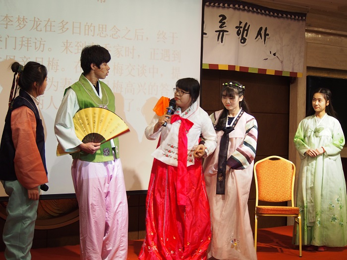 10月17日,应长春韩国人(商)会邀请,我院朝语系师生20余人前往新民宾馆与长春各高校朝鲜语系师生代表,驻长韩国留学生代表一同参加2015年“长春韩国周”活动开幕式暨长春中韩文化交流大会。韩国驻沈阳领事馆申凤燮总领事、东北三省韩国人联合会许景茂会长、锦湖轮胎长春工厂总经理,以及吉林省和长春市外事部门等相关领导一同出席。
