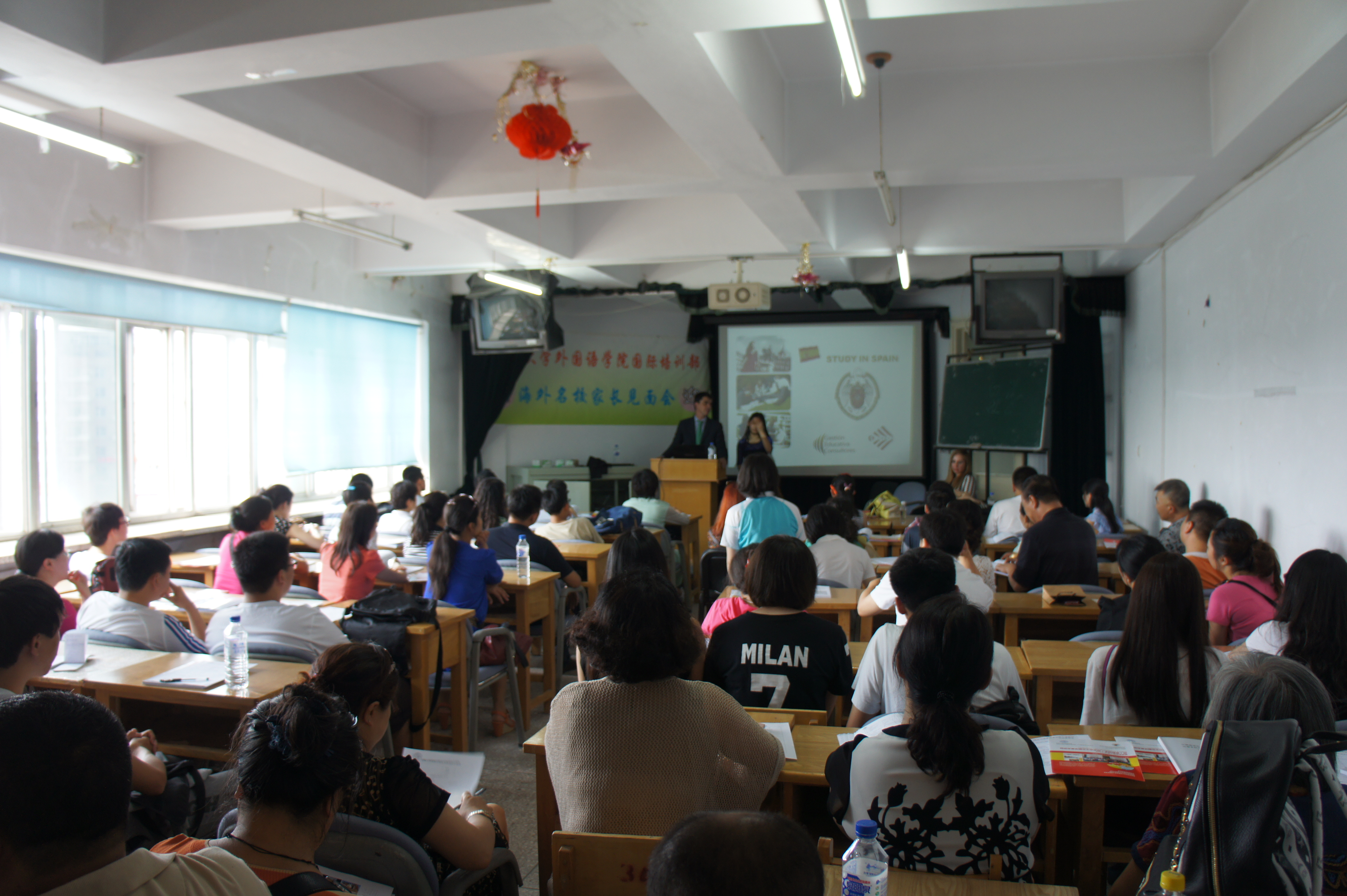 在外语楼508室举办了西班牙留学语言培训班宣讲会,60余名家长和学生参加了此次宣讲。会上,西班牙康普顿斯大学商贸旅游学院院长玛利亚·孔塞普西翁·加西亚·戈麦兹女士介绍了康普顿斯大学基本情况,西班牙高校入学申请中心主任胡安·卡洛斯先生介绍了项目情况,并与参会家长及学生进行了互动和沟通,会场气氛热烈。
