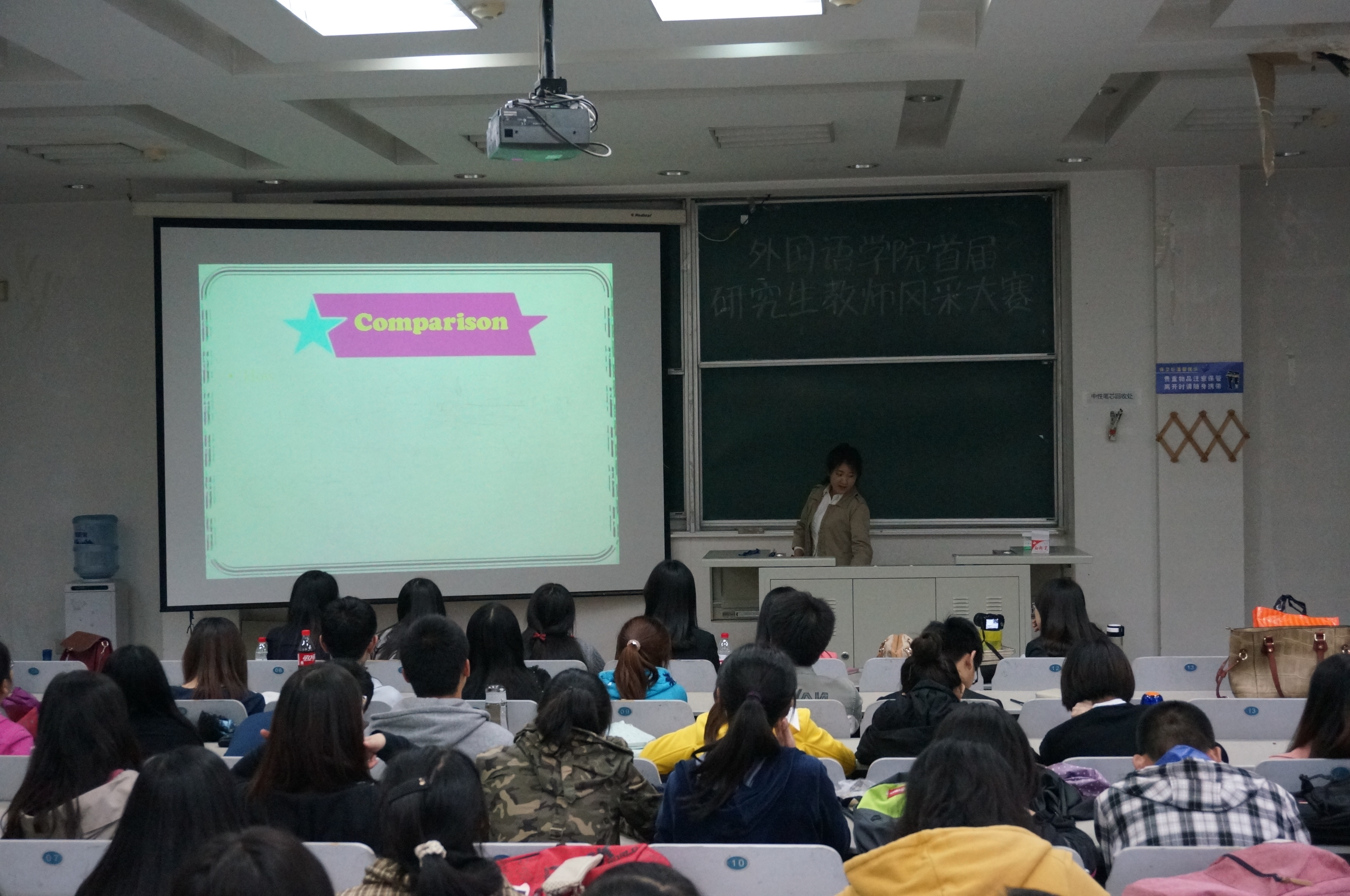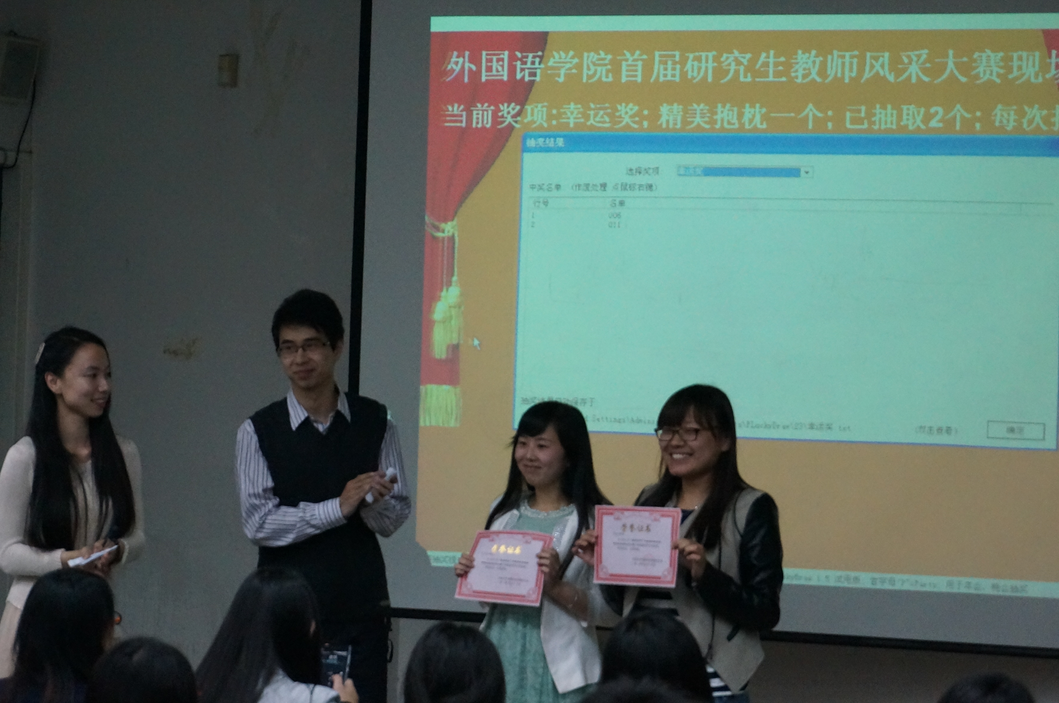 为了增强研究生的综合素质,提高研究生的实践能力,九色视频 于5月15日18:00在逸夫教学楼第六阶梯教室举办了“慎思笃行”九色视频 首届研究生教师风采大赛。学院2013级研究生与本科生代表参加了比赛。 本次大赛分为初赛和决赛两个环节。经过初赛的选拔,八名同学进入到决赛现场。本次决赛中,每名选手有十分钟的现场授课时间,最后由评委根据每名选手的现场表现进行评分和点评, 并且由20名本科学生选出最受学生欢迎的两名教师。决赛中选手们精彩而睿智的现场表现获得了评委老师和现场观众的一致好评。最终,经过评委打分和学生现场投票,2013级西班牙语语言文学专业苑雨舒获得一等奖,2013级英语语言文学专业徐杨、亚非语言文学专业范慧杰获得二等奖,英语语言文学专业李英菀、日语语言文学专业唐家林、俄语语言文学周磊获得三等奖。 外语专业研究生很大部分有未来从事教师行业的意愿,本次活动为学生提供了一个展示自我风采的平台,提升了学生综合素质和实践能力。同时,通过评委们的点评指导和现场观众的意见反馈,同学们了解了自己的实力和弱点,为下一阶段的学习提供了方向。