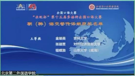 在2022年11月5日举办的第十五届“永旺杯”全国多语种口译大赛中,我院2021级朝鲜语口译专业金瑜美同学在高手如云的竞赛之中,克服了抽签顺序不利等因素,凭借着扎实的专业语言基础、强大的心理素质,一路披荆斩棘,过关斩将,得到了一众评委的广泛认可,在15位参加复赛的选手中取得了全国第四名、竞赛三等奖的优异成绩。