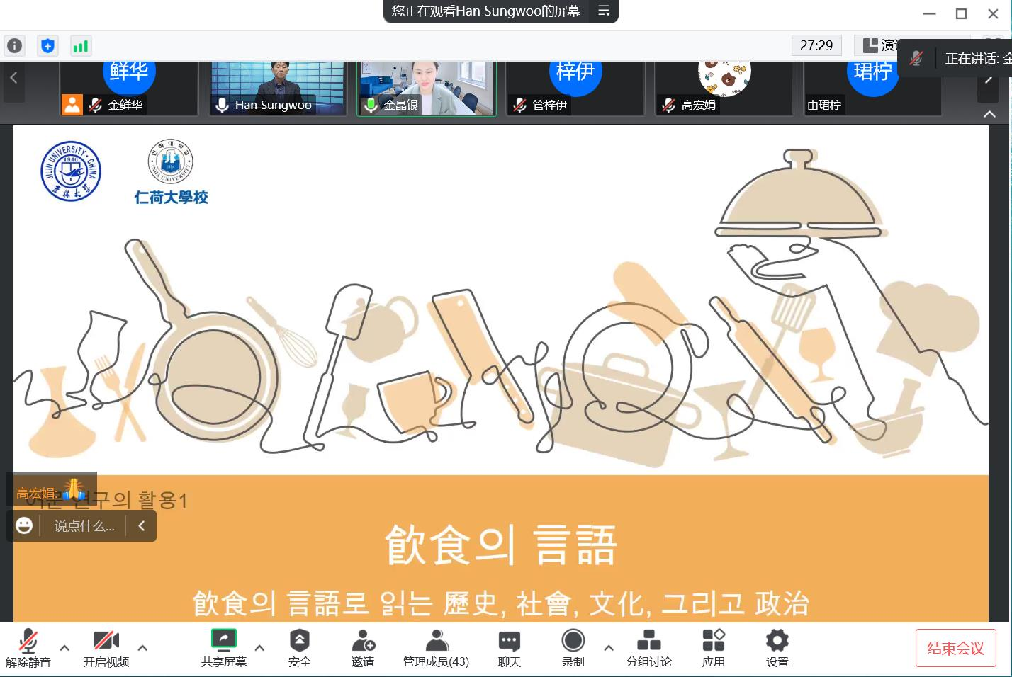 邀请,2022年11月11日15:30仁荷大学韩国语文学科韩成愚教授通过腾讯会议平台为我院进行了一场题为“韩国语研究和学习:饮食语言”的讲座。