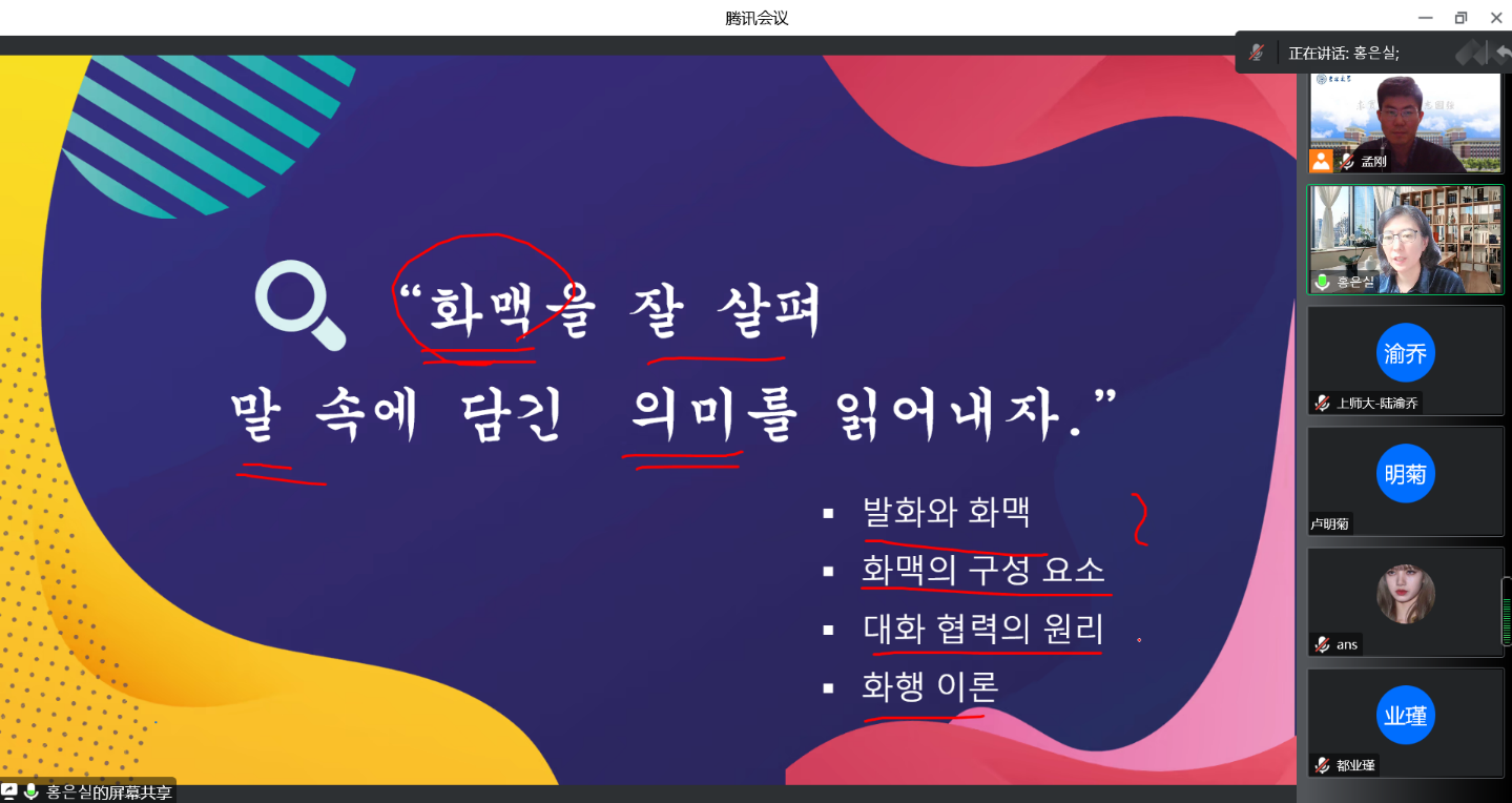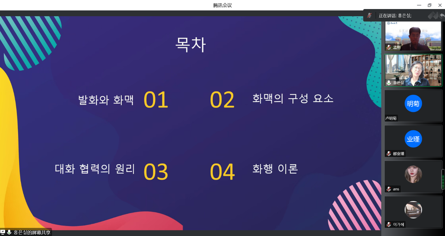 邀请,2022年11月16日15:30成均馆大学洪恩实老师通过腾讯会议平台为我院进行了一场题为“语境中的韩国语”的讲座,讲座由朝文系孟刚老师主持。