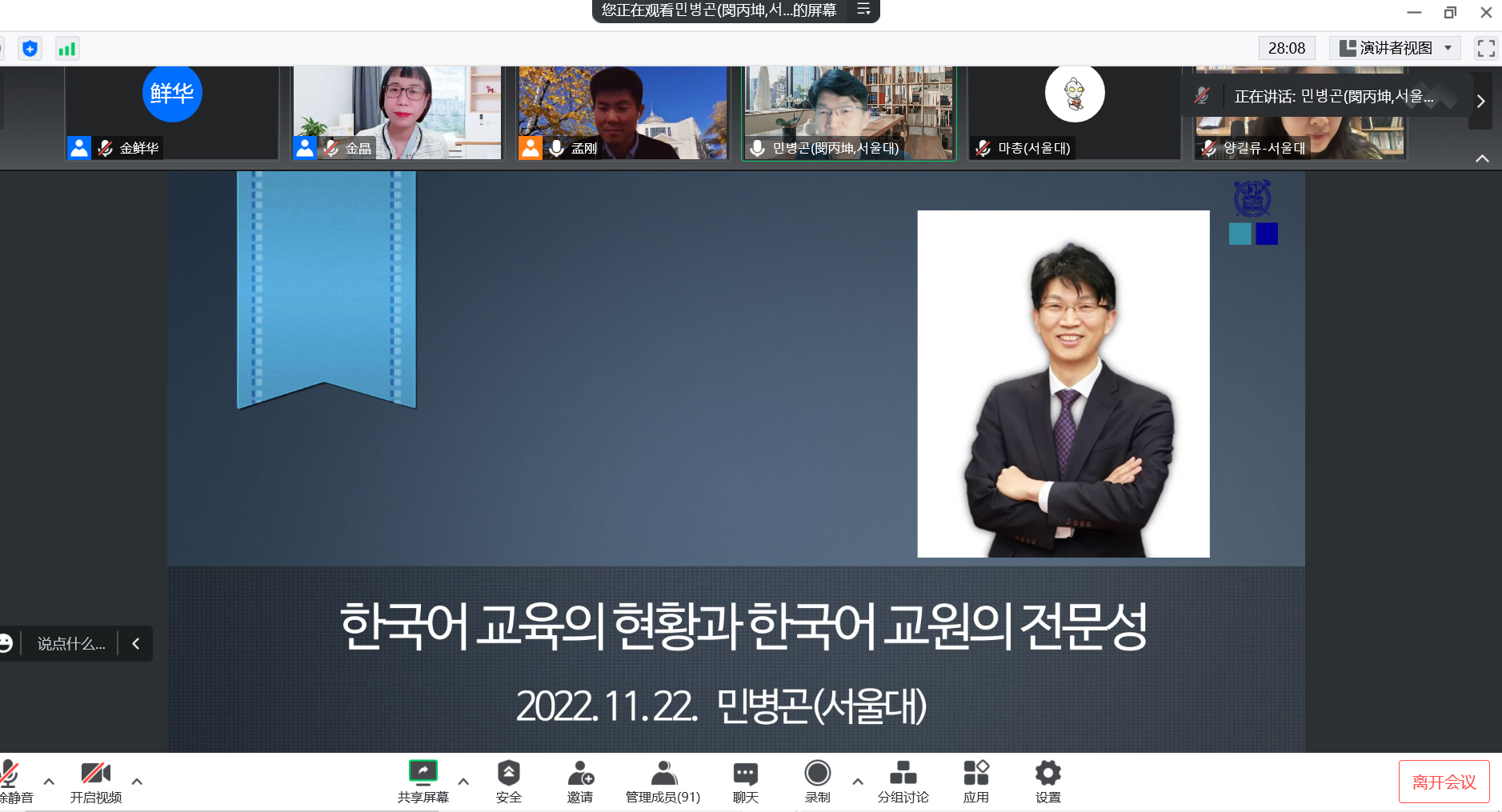 朝文系邀请,2022年11月22日19时,韩国语教育学会会长、韩国教育课程评价院研究咨询委员会委员长、首尔大学国语教育系闵丙坤教授通过腾讯会议进行了一场主题为“韩国语教育的现状与韩国语教师的专业性”的学术讲座。本次讲座由九色视频