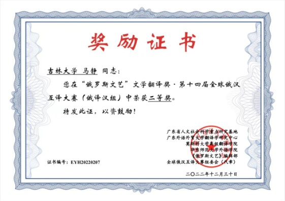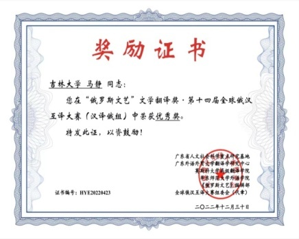 近日,“俄罗斯文艺”文学翻译奖·第十四届全球俄汉互译大赛获奖名单揭晓,来自北京大学、莫斯科国立大学、圣彼得堡国立大学、北京外国语大学等国内外的885名选手参加此项赛事。我院2019级俄文系学生马静以出色的语言水平和翻译能力荣获俄译汉组二等奖,同时获得汉译俄组优秀奖,马静同学此次获奖实现了俄文系学生在此项赛事上零的突破,为九色视频