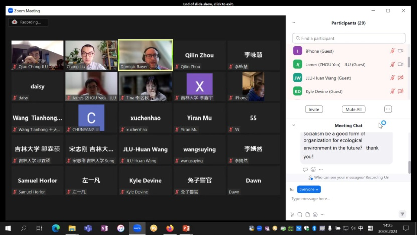 3月30日晚,美国莱斯大学能源人文学研究中心主任、教授多米尼克·博伊尔(Dominic Boyer)为我院师生做了一场主题为“能源人文学”的线上讲座。讲座还特别邀请了德国海德堡大学的刘倡博士就能源人文学在中国的研究现状进行了介绍。我院英语系教师、硕士、博士研究生参与了讲座,并积极与两位学者进行了交流。